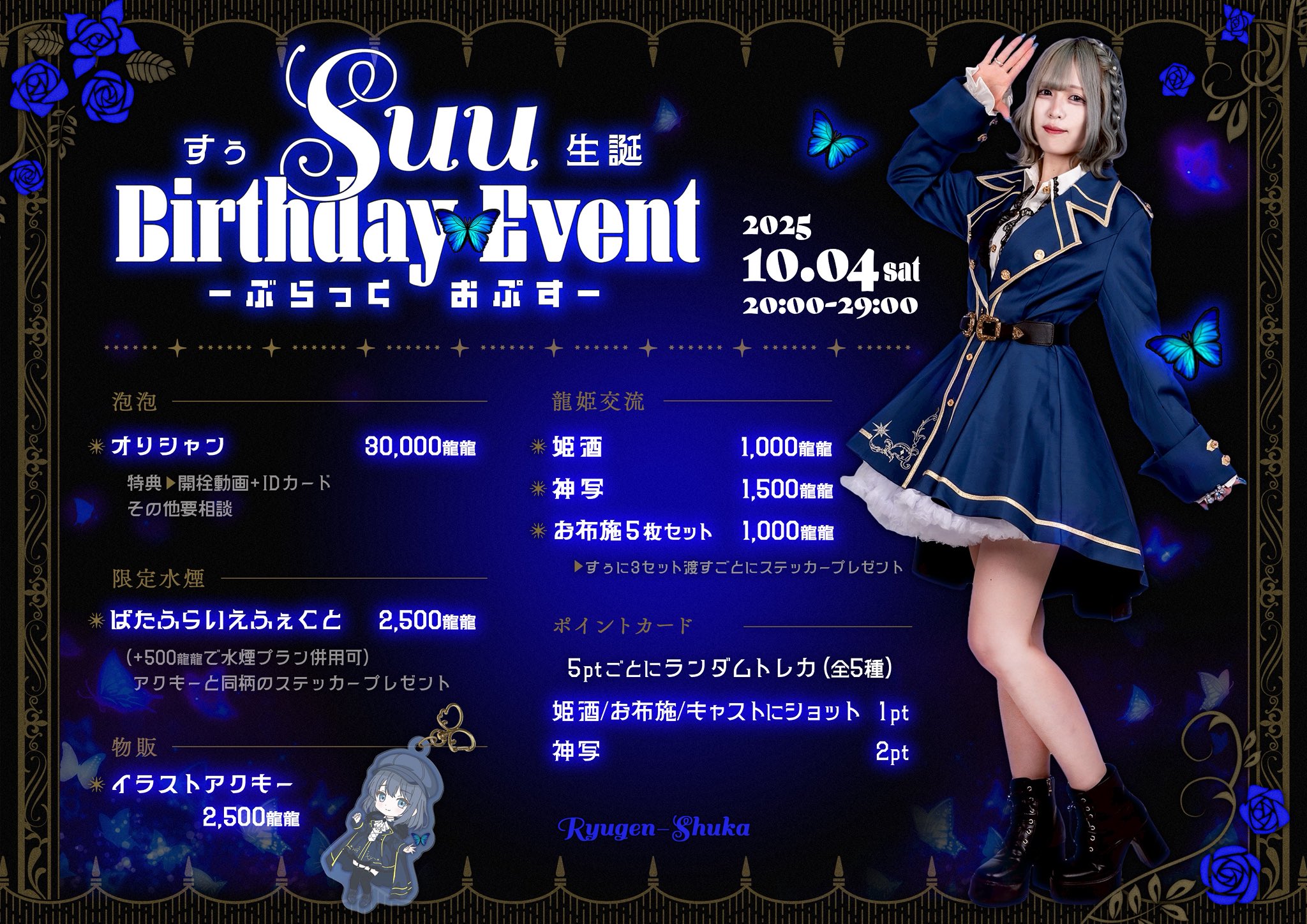 🫧🦋Suu Birthday Event🦋🫧 -ぶらっくおぷす- 10/4(土)20:00~29:00 🥂泡泡 *オリシャン 30,000龍龍 特典▶︎開栓動画+IDカード その他要相談 💭限定水 […]