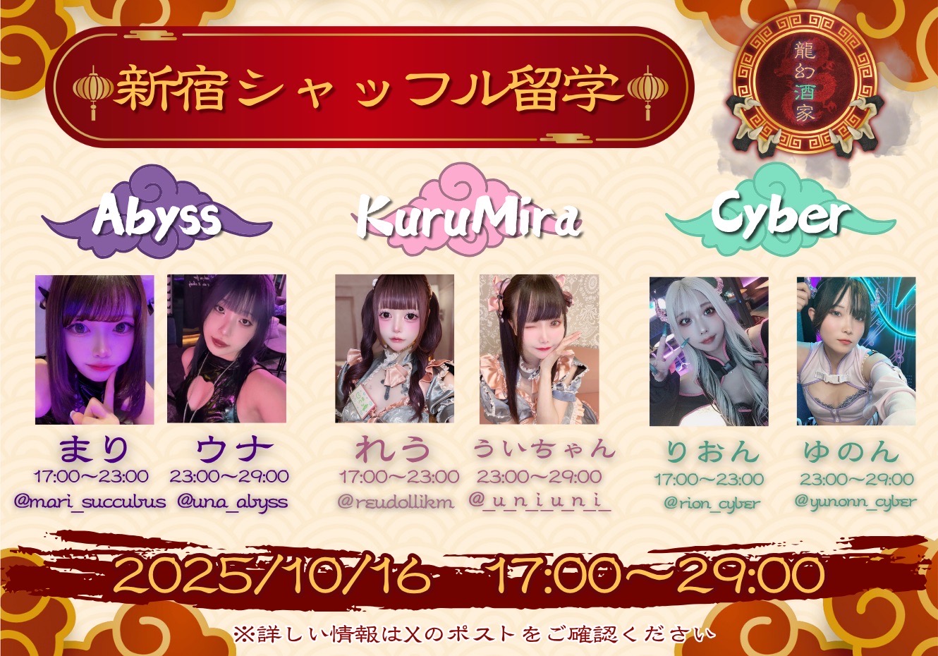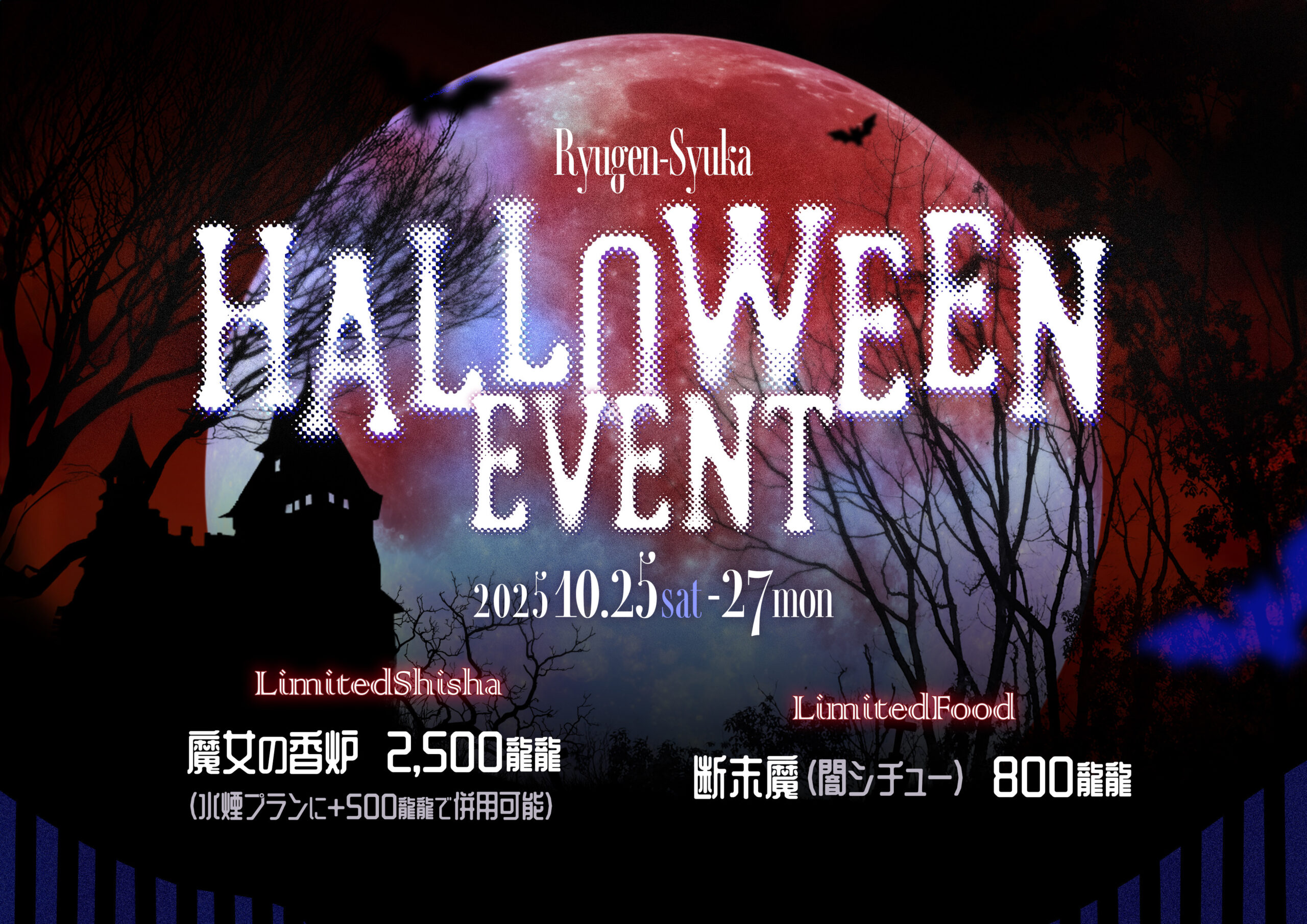 艶やかな龍姫たちが、闇夜に浮かぶ幻想の宴へご招待――。 香る煙とともに、甘く妖しい夜をお過ごしください。 限定ハロウィンシーシャやフードもご用意しております。 龍姫はハロウィンの特別衣装で降臨します🐉 &n […]